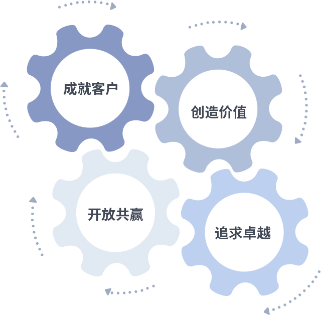 成就客户是一切决策的出发点,创造价值是衡量所有工作的标准,追求卓越是米兰(中国)做事做人的态度,开放共赢是米兰(中国)的格局也是最终的结果。价值观的齿轮环环相扣,推动着组织里的每个人不断向前。